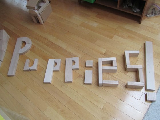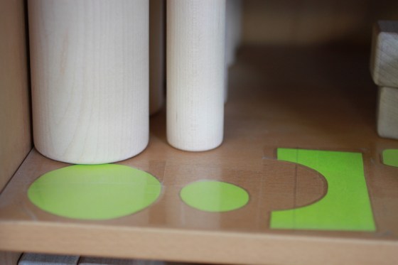 I label the shelves to make it easier for the children to clean up (they would rather leave their creations up forever, though!!). This offers a great opportunity for them to practice math through one-to-one correspondence (i.e.: one block to one place), as well as responsibility and team work – everyone joins in the game here: including us!