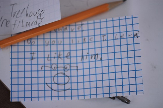 We now have a construction site – an ‘almost’ finished tree house. When the first floor was installed (about 6″ above ground level), climbing up and down brought much excitement. The platform provided a great location for testing out gravity – our own version of the leaning tower of Pisa. The boys’ pictures, stories and sculptures were suddenly flooded with representations of tree houses.